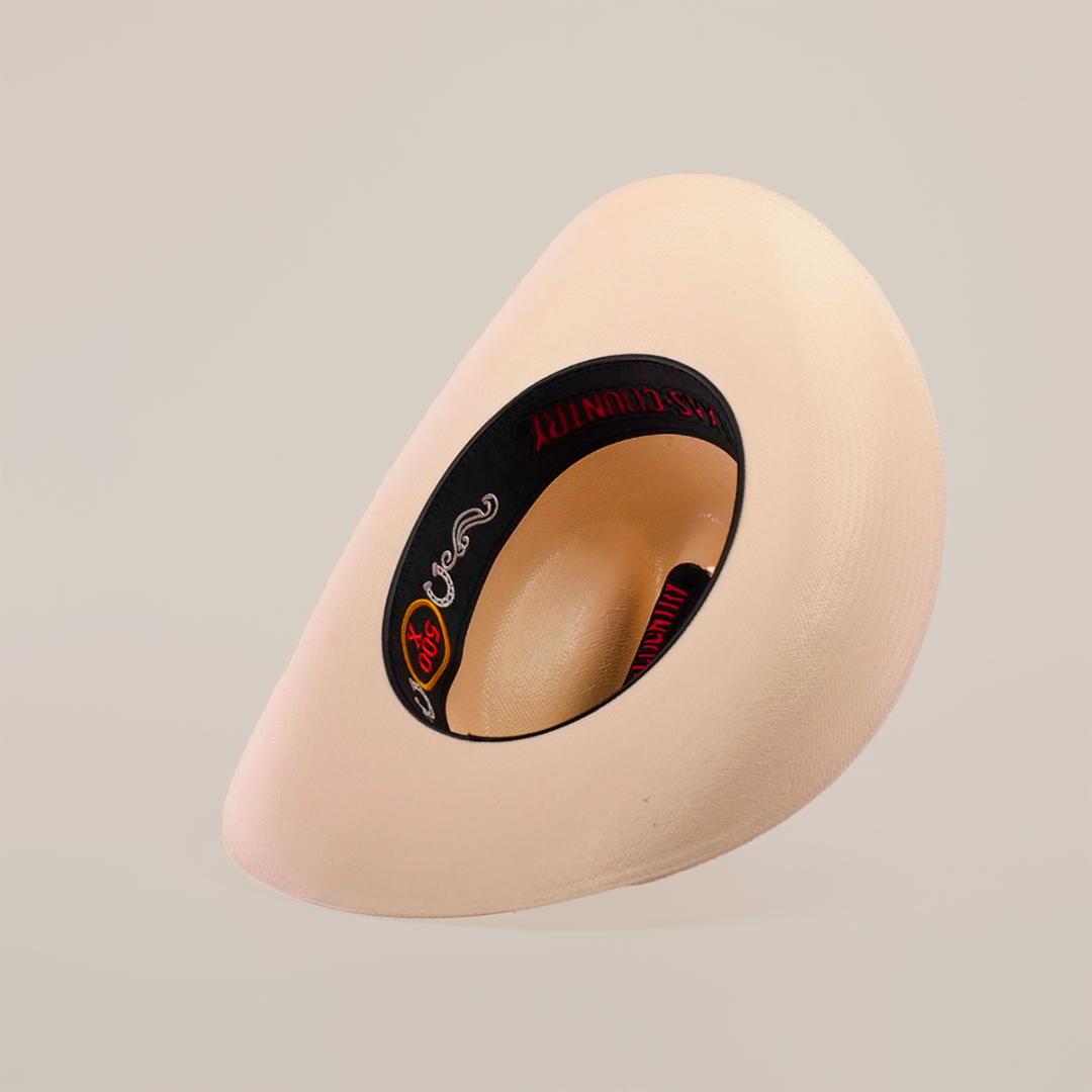 The 500X Sinaloa Straw Hat is a cream-hued cowboy hat with a slightly curved brim and indented crown, set against a plain white backdrop. It boasts timeless style and top-notch quality, featuring a black band with decorative emblems around the crowns base.